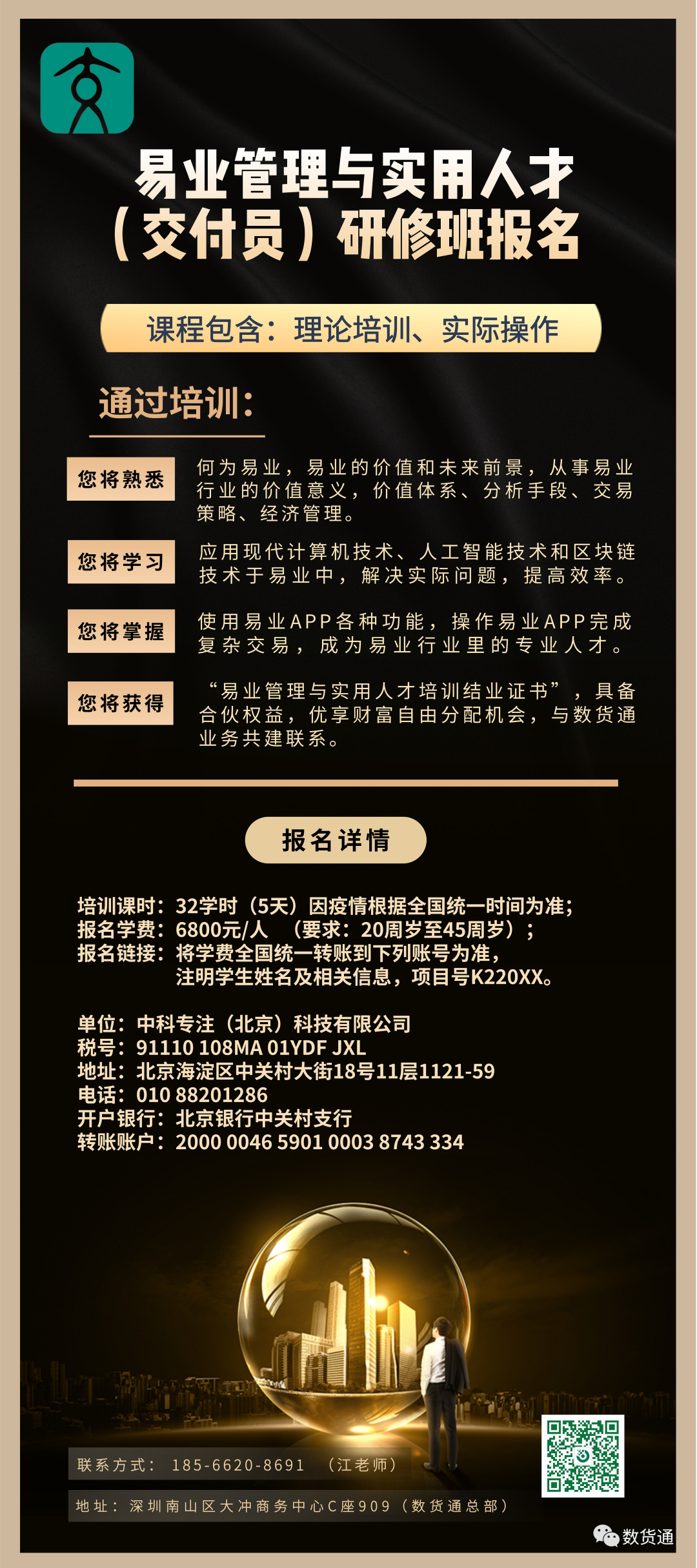 理论培训:货币理论和商品流通,易货贸易的历史及特性,易业系统中的商品交换与价值评估,定价机制及反向定价法,与易货有关的会计学与税务法,信息技术伦理学,易货贸易管理与经济分析,交易策略和做市商制度,大数据分析及应用,人工智能在商品交易中的应用,区块链技术与商品流通;