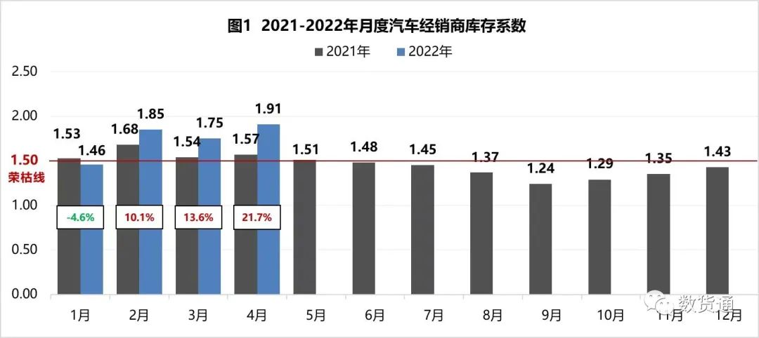 和他们预测的一样,4月汽车经销商综合存量系数达到了1.91,同比上升21.7%,存量水平位于警戒线以上。