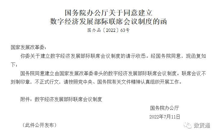 7月25日,国务院办公厅发布《关于同意建立数字经济发展部际联席会议制度的函》,国务院同意建立由国家发展改革委牵头的数字经济发展部际联席会议制度。